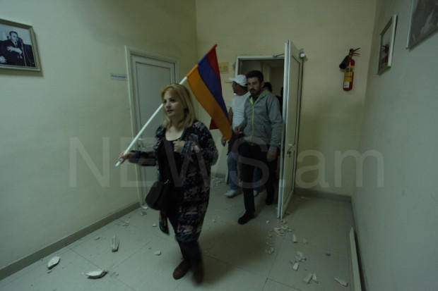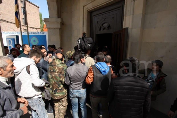 The protestors headed by Civil Contract Party leader Nikol Pashinyan broke into the building of the Public Radio of Armenia, demanding airtime to voice their protest against Serh Sargsyan's nomination for the seat of a prime minister.