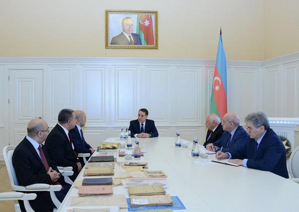 Researcher, Doctor of Science in Sociology, doctoral student at Istanbul University Afgan Valiyev handed the national flag and archive material relating to the Azerbaijan Democratic Republic epoch – handwritten letters, documents, maps – to Prime Minister Novruz Mammadov.