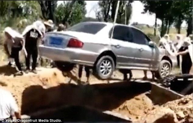 Mourners were seen paying their respects at the service and standing around to guide the car into its large grave. The car still had its license plate attached.