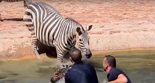 Visitors of Valencia Bioparc Zoo were watching a zebra give birth to a baby when it suddenly fell in the water.