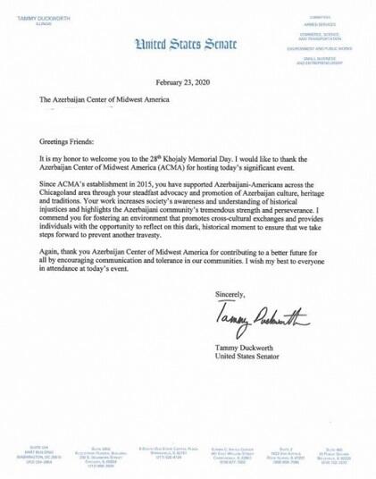 Senator Tammy Duckworth of Illinois and congressman Bobby Rash, who represents the first constituency of the state in the US Congress, appealed to the Azerbaijani community in the United States on the 28th anniversary of the Khojaly massacre.