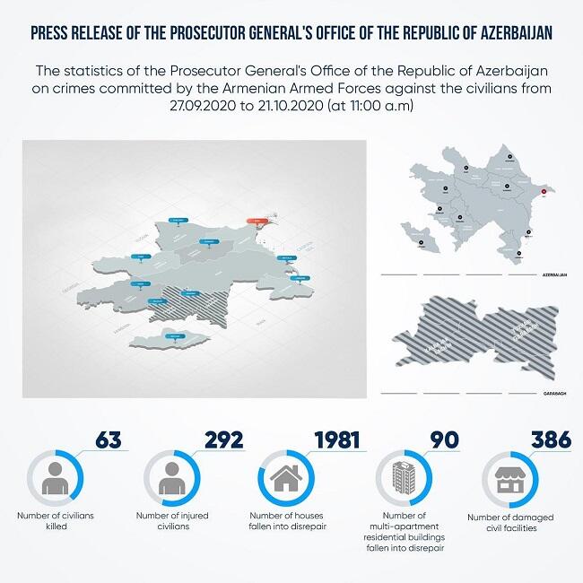 As a result of Armenians' shelling residential settlements from September 27 until now, 63 civilians have been killed, 292 injured.