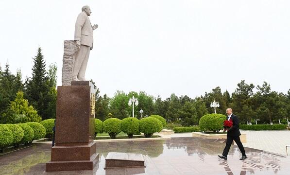 Axar.az reports that the head of state laid a wreath at the monument to national leader Heydar Aliyev in the centre of Hajigabul.