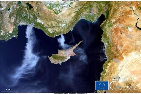 Smoke rising from Turkey due to fires has reached the middle of the Mediterranean.