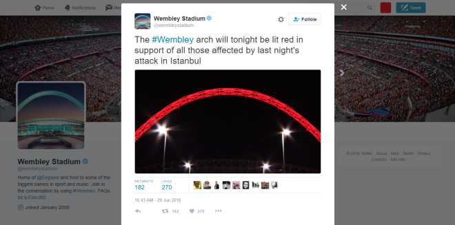 “Wembley’s arch is red tonight as a mark of respect and sympathy following the attacks outside Beşiktaş’s stadium in Turkey yesterday,” it said, while also tweeting similar sentiments.