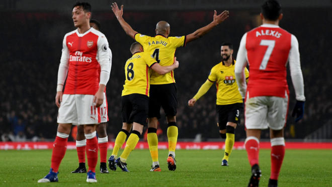 Former Tottenham defender Younes Kaboul lashed in the opener within 10 minutes for Watford with a shot from outside the area which deflected off Aaron Ramsey.