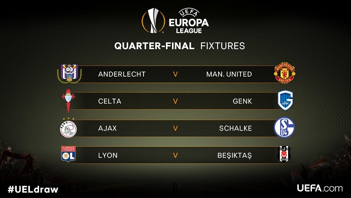 Manchester United will play current Belgian league leaders Anderlecht in the Europa League quarter-finals. José Mourinho’s side travel to Brussels on April 13, with the second leg at Old Trafford a week later.