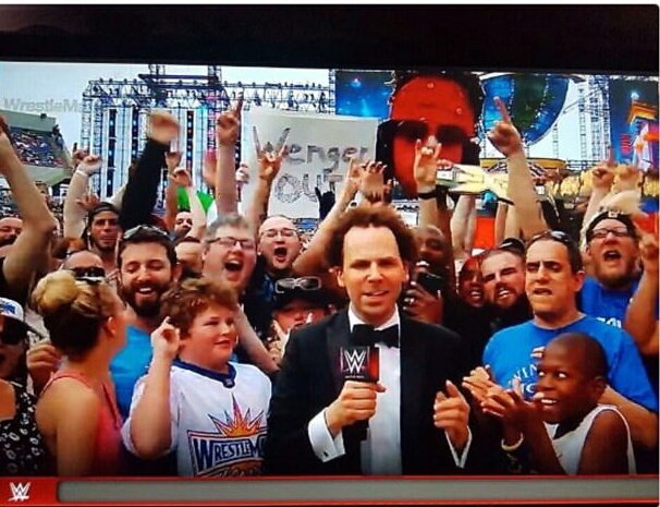 Arsenal supporters calling for Arsene Wenger to be removed from his post this summer have taken their campaign to Wrestlemania in Orlando, Fla.