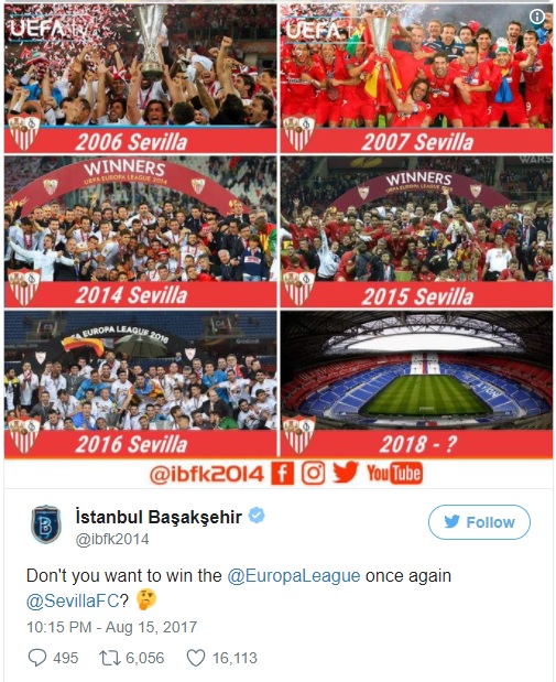 Axar.az reports that a day before the match Başakşehir tweeted a collage of photos showing Sevilla lifting the Europa League cup, Europe's second most prestigious club trophy, asking: "Don't you want to win the Europa League again?"
