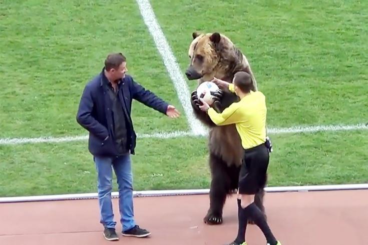 Welp, you'd be wrong because that is what happened in the Russian 3rd division match between Mashuk-KMV and FC Angusht Nazran over the weekend, when man led a muzzled brown bear to the edge of the pitch, where the animal clapped to the supporters and was also tasked with handing the match ball to the referee.