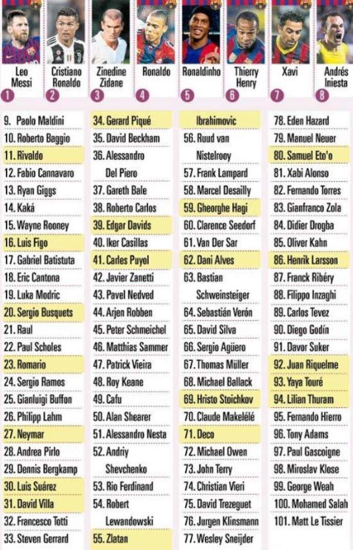Axar.az reports that, for their June edition, FourFourTwo created a list where they ranked the top 101 players in the past quarter of a century.