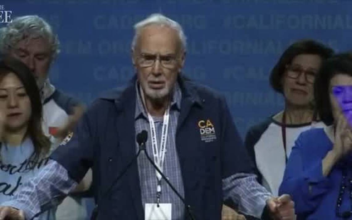 Outgoing boss John Burton, described by the Los Angeles Times as “a fixture in state Democratic politics for half a century”, grinned as supporters on stage at the party's convention joined him in the gesture.