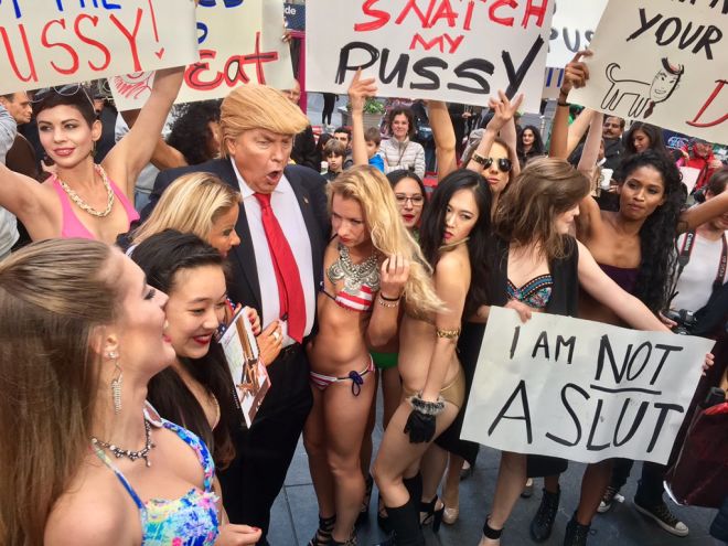 She said she is:” Always in trouble – Recently in Manhattan with my ‘ Donald Trump’ and 40 bikini clad protesting women holding placards, such as Don’t snatch my pussy and I am not a slut, outside Trump Tower. The NYPD stopped me and us and stopped again and again and again etc.. they ended up not being able to do anything as the thousands of people flash mobs running across roads and 5th ave to see stopped them by surprise and they had to release us and the NYPD were causing the disruption they were trying to stop…