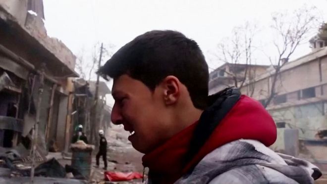 In a harrowing amateur video, released by the Syria Civil Defence (the White Helmets), a boy can be seen crying over his mother’s dead body in Aleppo.