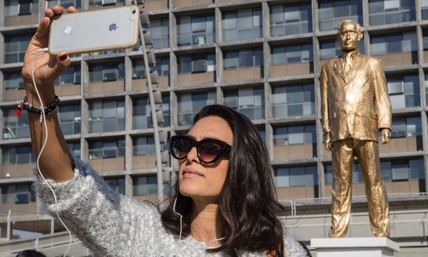 Morning commuters quickly gathered to take photographs and debate whether the statue should be seen as mockery of Netanyahu or homage to the rightwing prime minister, now in his fourth term and known by his childhood nickname “Bibi”.