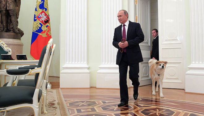 Axar.az informs that, Putin came to the interview with his Akita dog. “I was told that you wanted to see my dog, Yume. You can see that she is in great shape”. – Putin said.