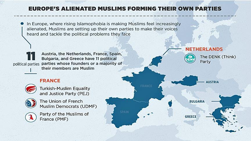 Axar.az reports Europe or European territories have 11 political parties founded by Muslims or with mostly Muslim membership. Parties in France, Austria, the Netherlands, Spain, Bulgaria, and Greece were founded to counter the rising tide of Islamophobia and discrimination against Muslims in Europe.