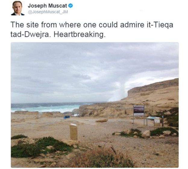 Malta's Prime Minister Joseph Muscat said on Twitter: "Reports commissioned over the years indicated that this landmark would be hard hit by unavoidable natural corrosion. That sad day arrived." Roger Chessell, from the village of Xaghra, told the Times of Malta: "There was a big raging sea beneath the window. Suddenly, the arch collapsed into the sea."