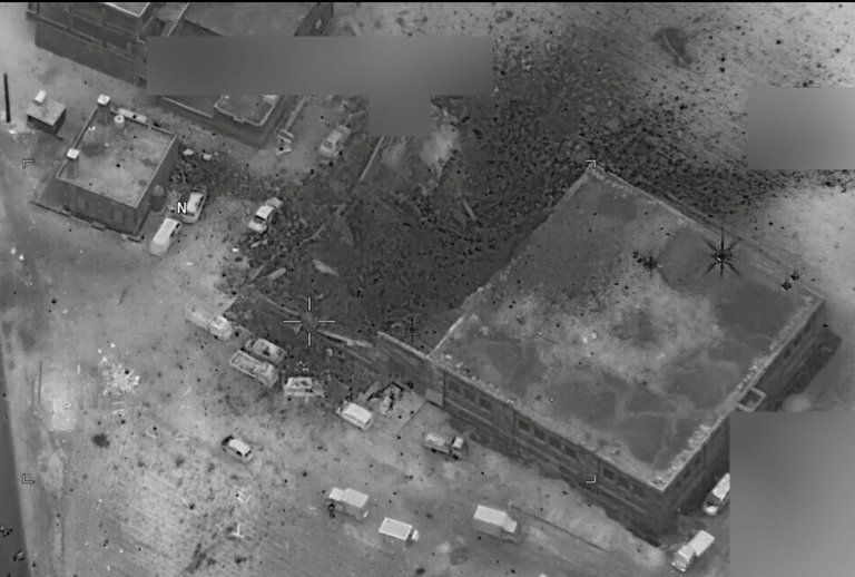 American military officials said the picture was taken within five minutes after the attack was carried out, around 7 p.m. local time, by drones armed with Hellfire missiles and at least one warplane equipped with satellite-guided bombs.