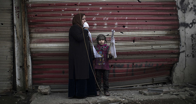 A girl stands with a woman holding a white flag to show they are civilians, as they flee their home on the western side of Mosul, Iraq, Monday, March 13, 2017.