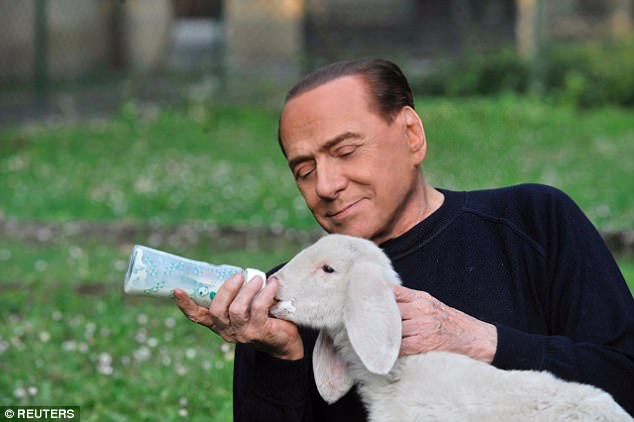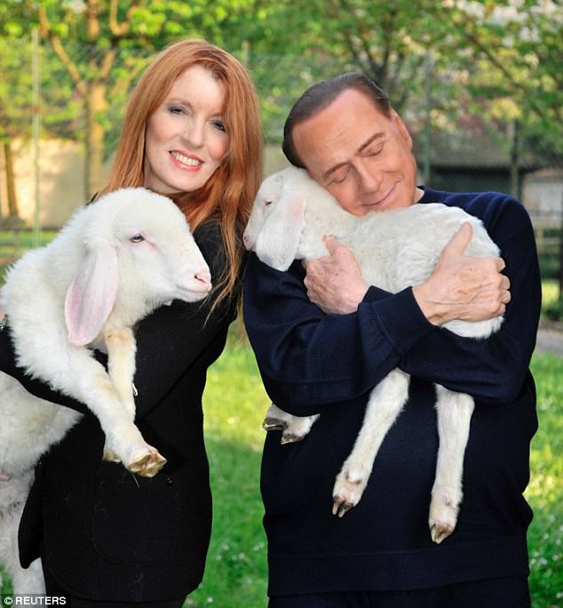 Berlusconi, 80, who decided he was vegetarian last year, was pictured cuddling, kissing and feeding the lambs with a baby's bottle along with his 31-year-old girlfriend Francesca Pascale.