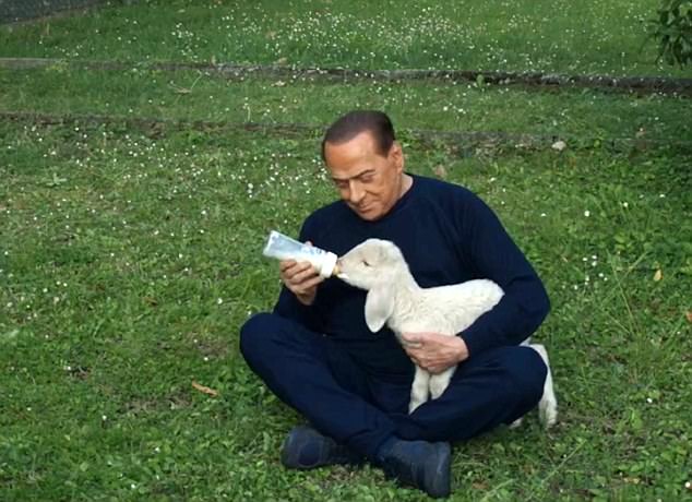 The four-times prime minister was filmed in his parkland estate in Arcore outside Milan in front of a sign saying 'Defend life, choose a vegetarian Easter', while a scrolling message urged viewers to 'Be like him. He saved five lambs from the Easter slaughter.'