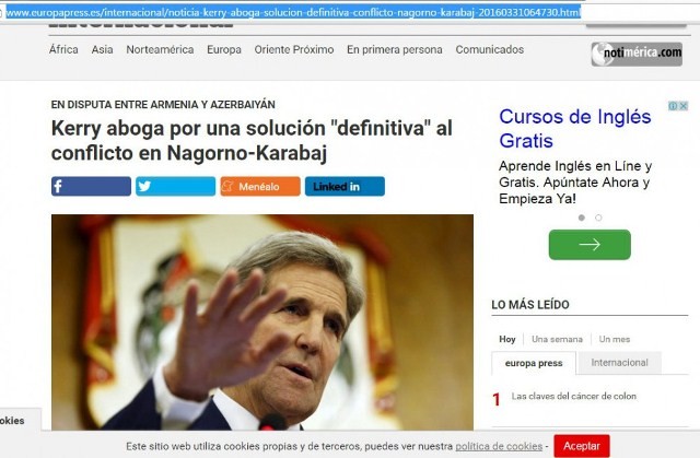 News portal of Spain, “europapress.es” has published an article headlined “ Kerry supports ultimate resolution of Nagorno - Karabakh conflict" that is on the meeting between Azerbaijani President Ilham Aliyev and U.S. Secretary of State John Kerry.