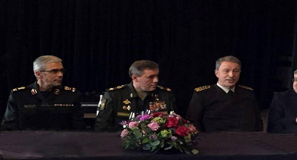 The meeting with Russian Chief of General Staff Gen. Valery Gerasimov and Iranian Maj. Gen. Mohammad Bagheri came ahead of Wednesday's trilateral summit on Syria with the participation of Turkey's Recep Tayyip Erdogan, Russia's Vladimir Putin and Iranian President Hassan Rouhani.