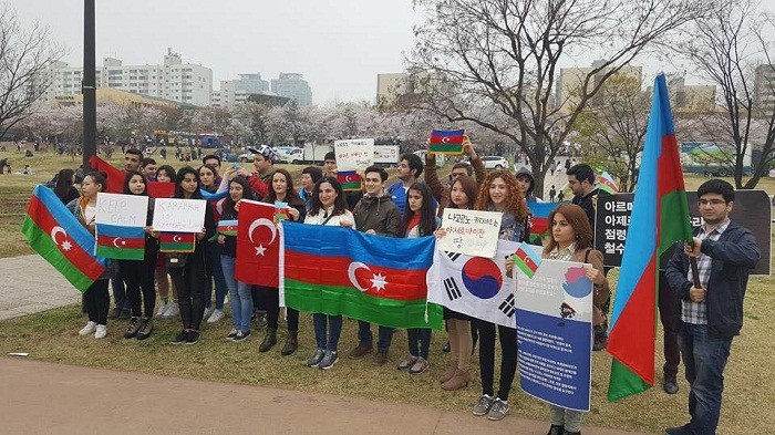 At least 40 Azerbaijani students, including Turkish, Malaysian and Korean students gathered in the central Youido of Seoul. Slogans such as `Armenia is an aggressor`, `Leave our lands`, `Karabakh is Azerbaijan` and `The world community should condemn Armenian aggression` were chanted at the event.