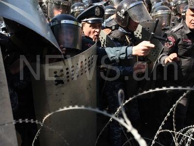 Earlier on Monday, police had to use force against opposition activists who tried to climb through razor wire barriers and break into the Armenian parliament building.