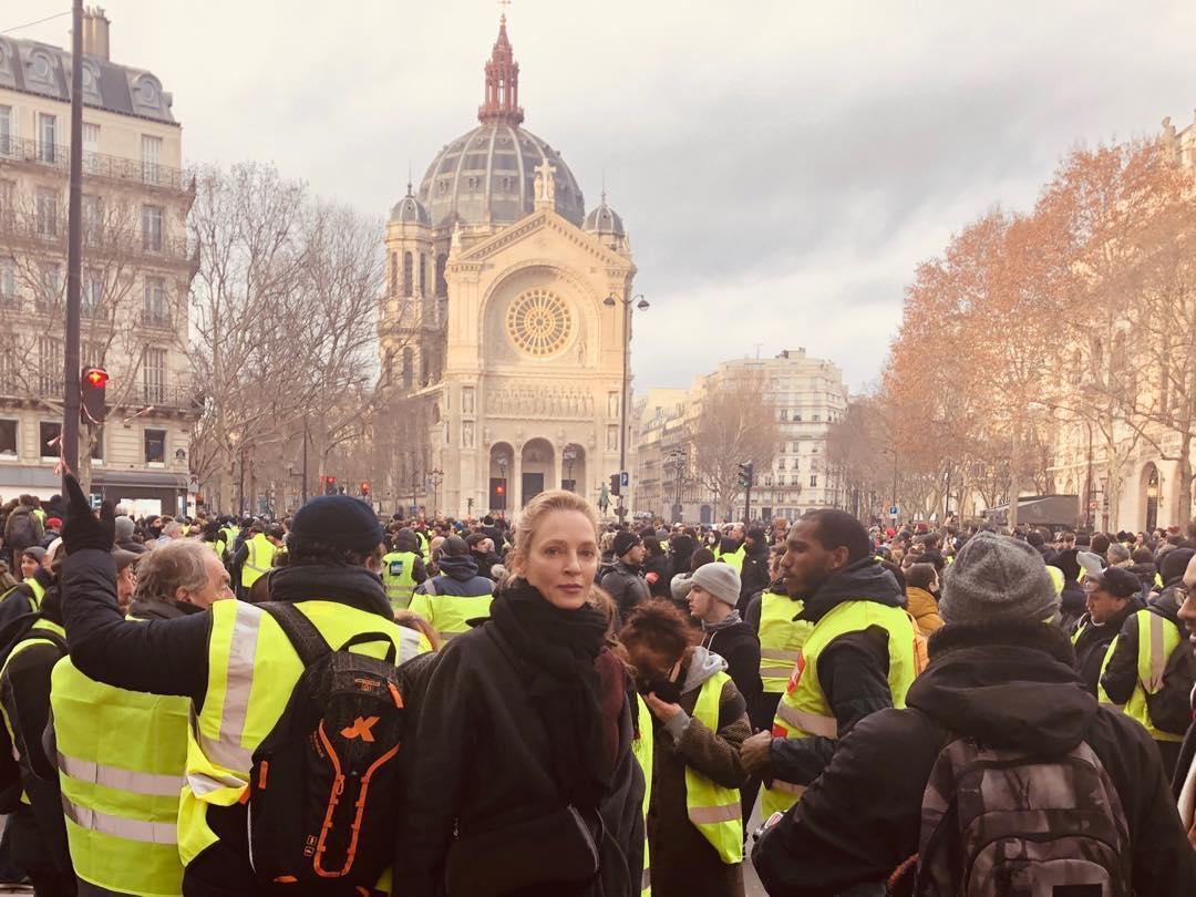 The 48-year-old Thurman has shared a photo of herself standing in a crowded Paris square in front of Saint-Augustin Church, surrounded by people wearing reflective yellow jackets — the symbol of the ongoing protests in France.