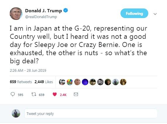 "I am in Japan at the G-20, representing our Country well, but I heard it was not a good day for Sleepy Joe or Crazy Bernie. One is exhausted, the other is nuts - so what’s the big deal?"