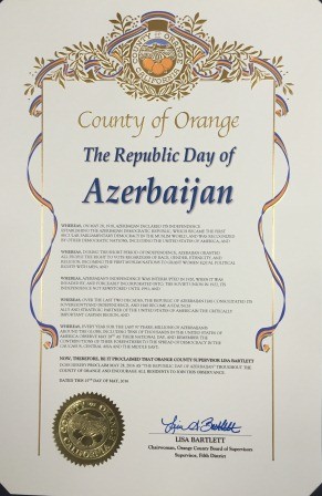 Consulate General declares that West Hollywood, Santa Monica and Torrens cities have adopted relevant decisions and announced May 28 as Azerbaijan National Day in the mentioned cities. As well as Orange County Board of Supervisors announced May 28 as Azerbaijan National Day and called all residents to celebrate this day.